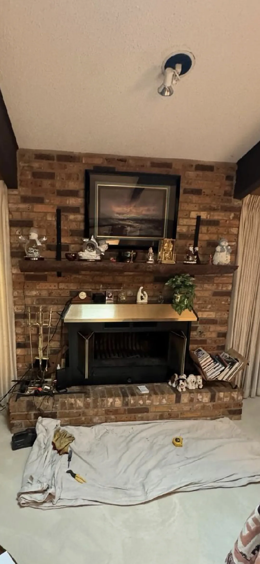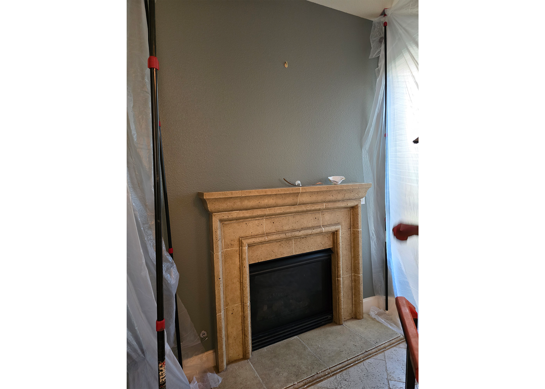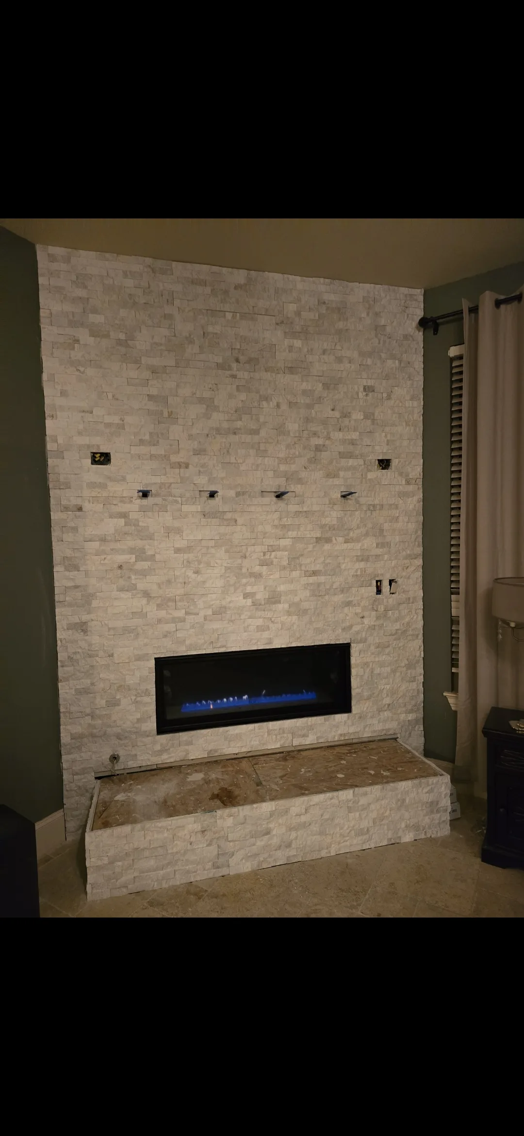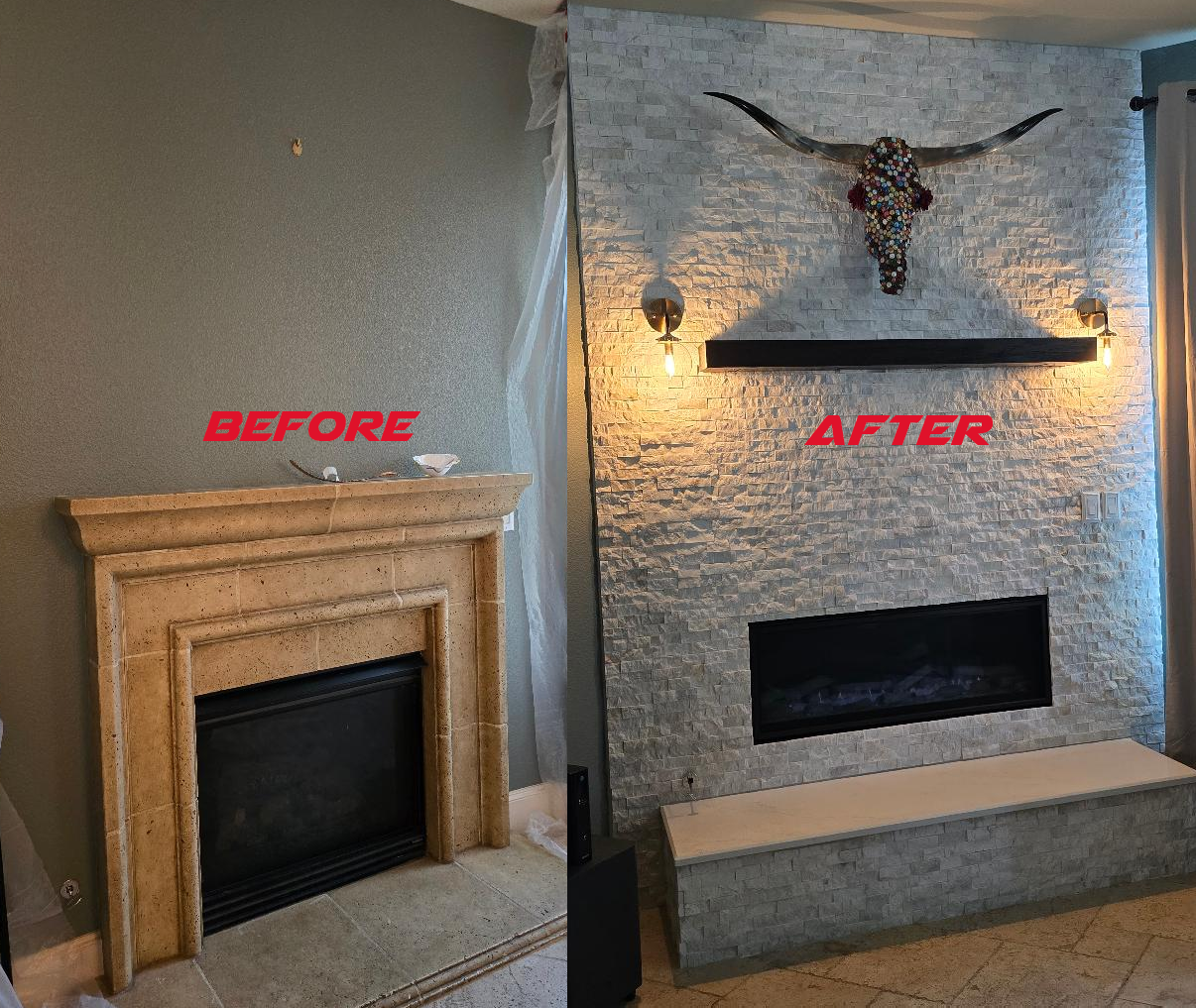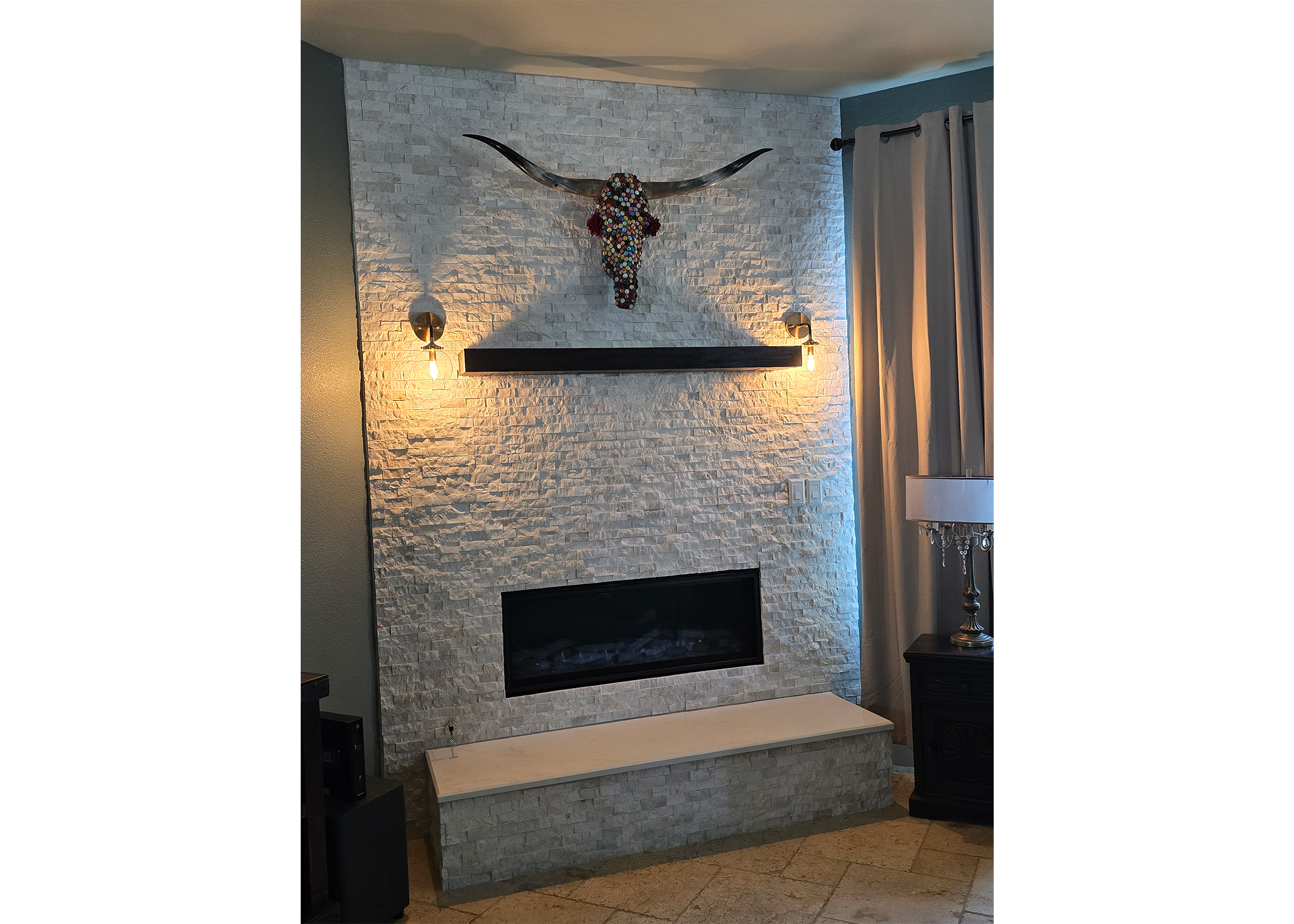 Removed old fireplace to install new linear unit. Stone ledger, hearth, mantel shelf, scone lights and long horn mounted.