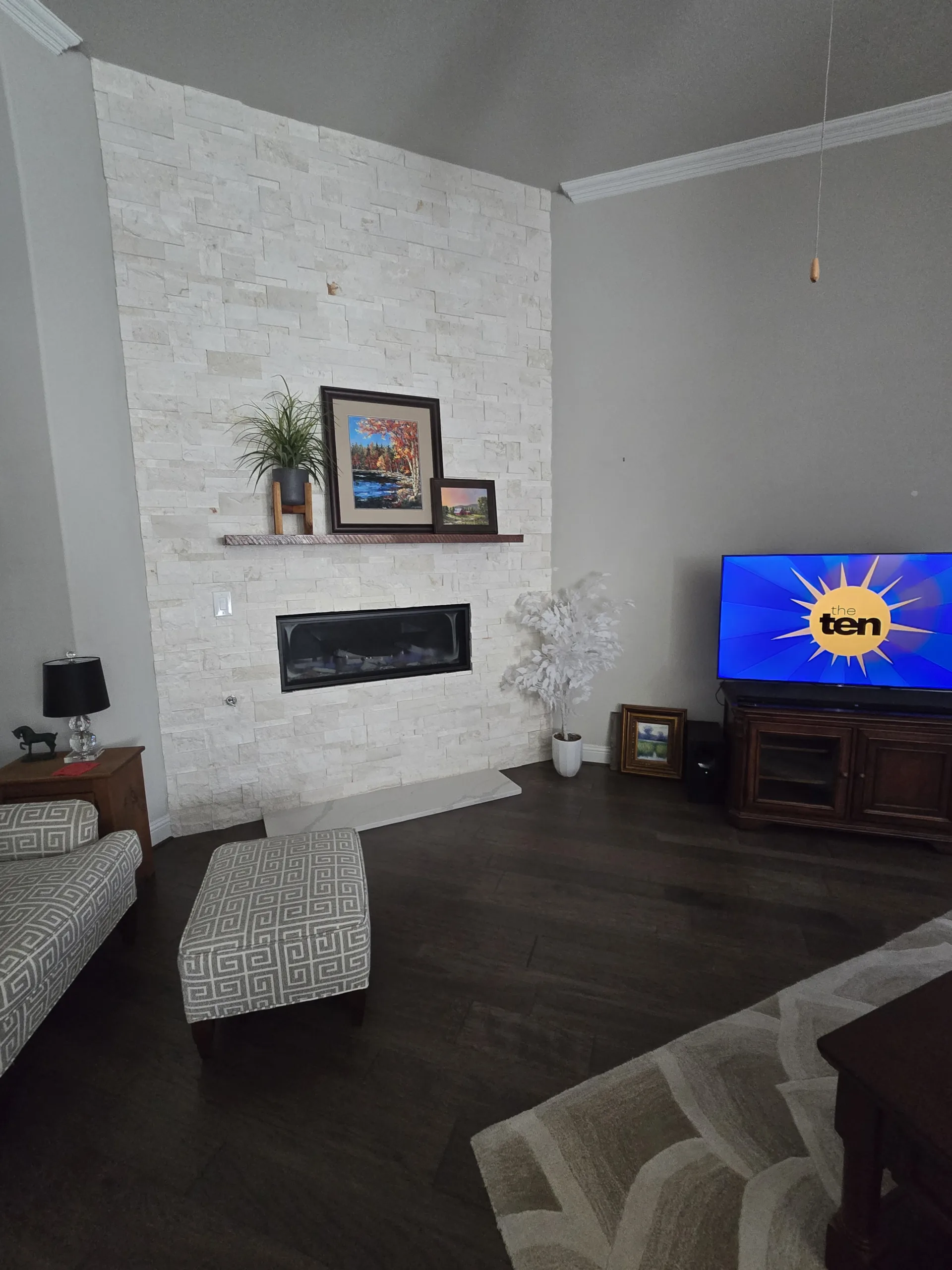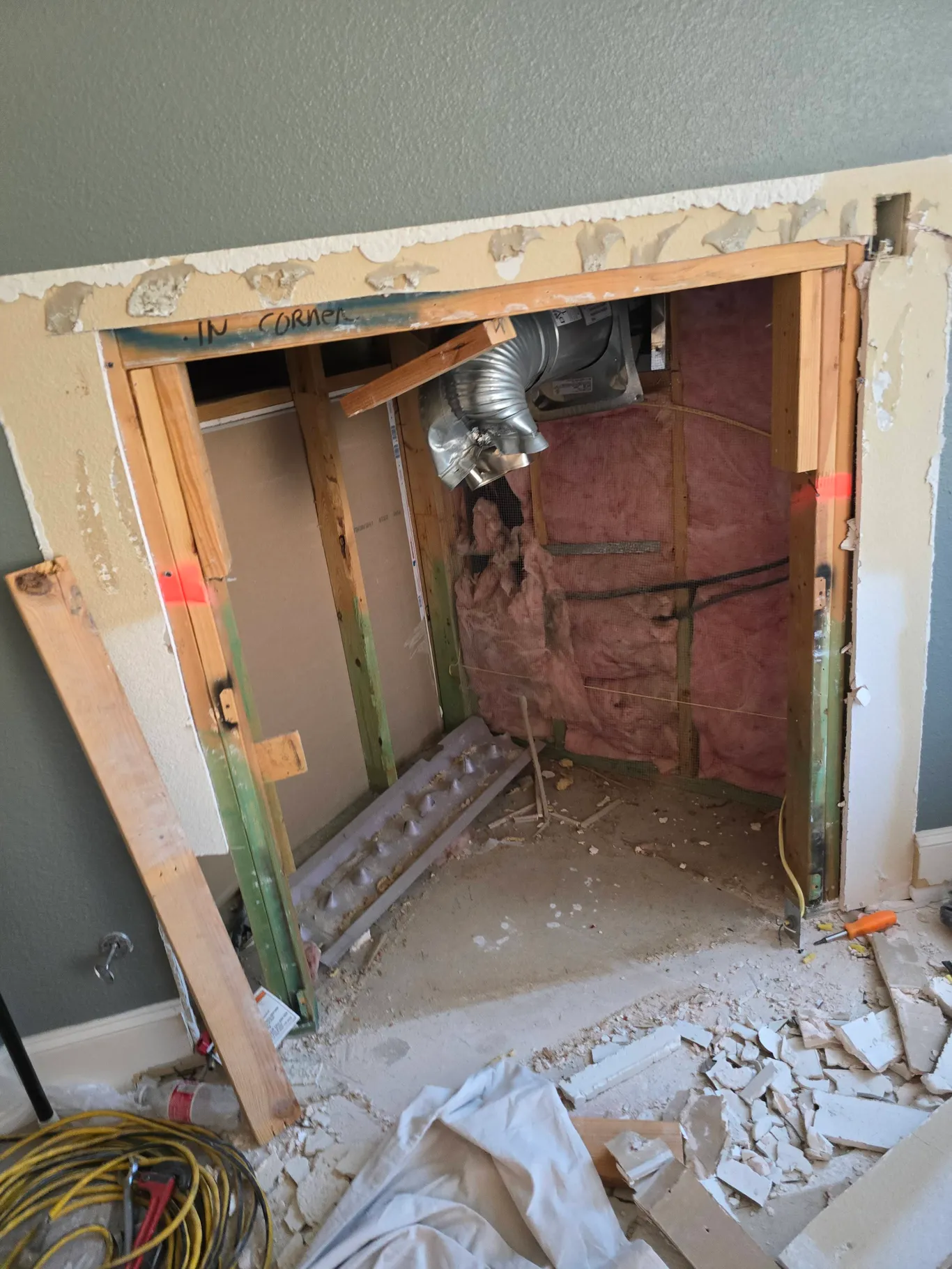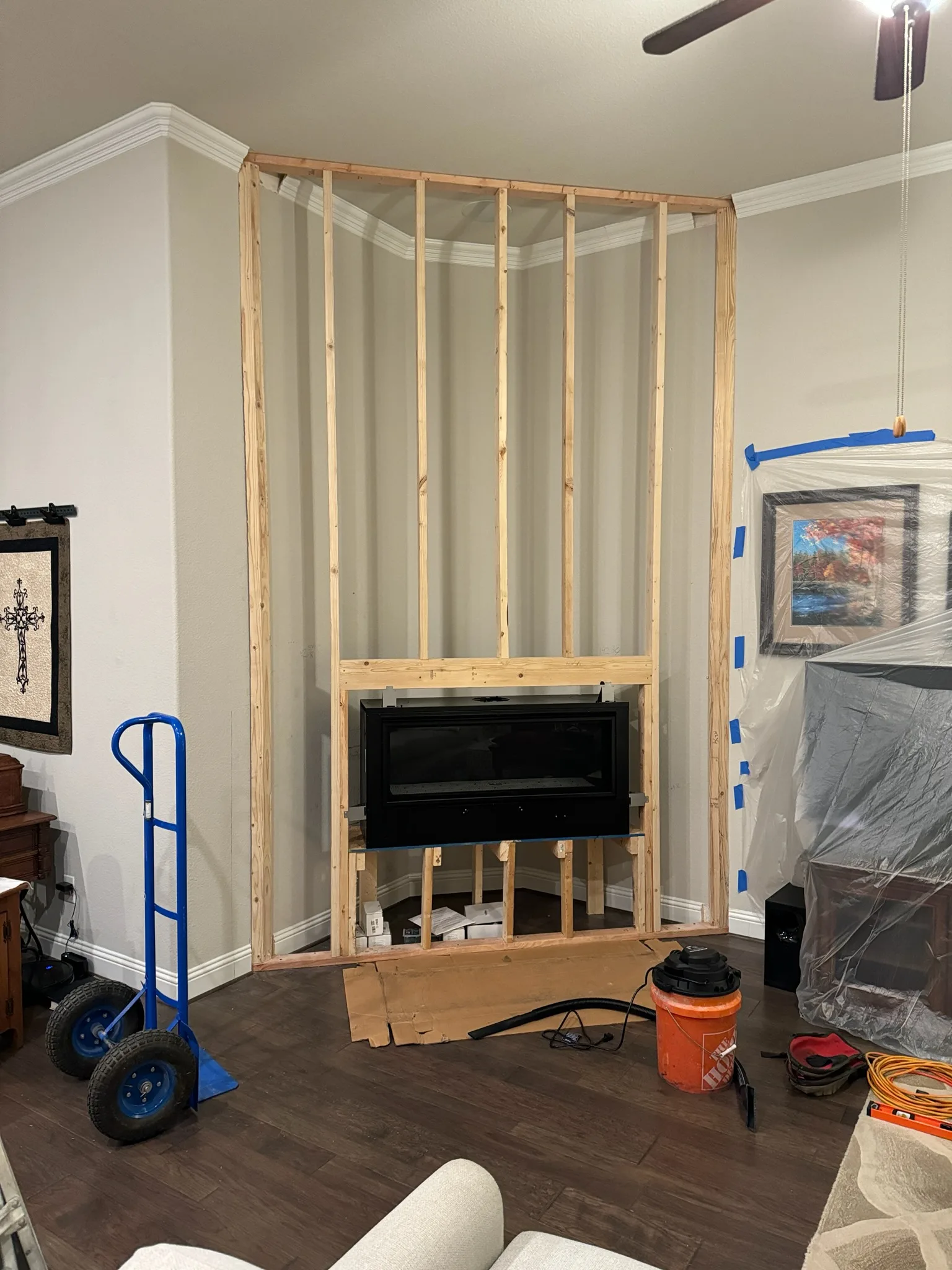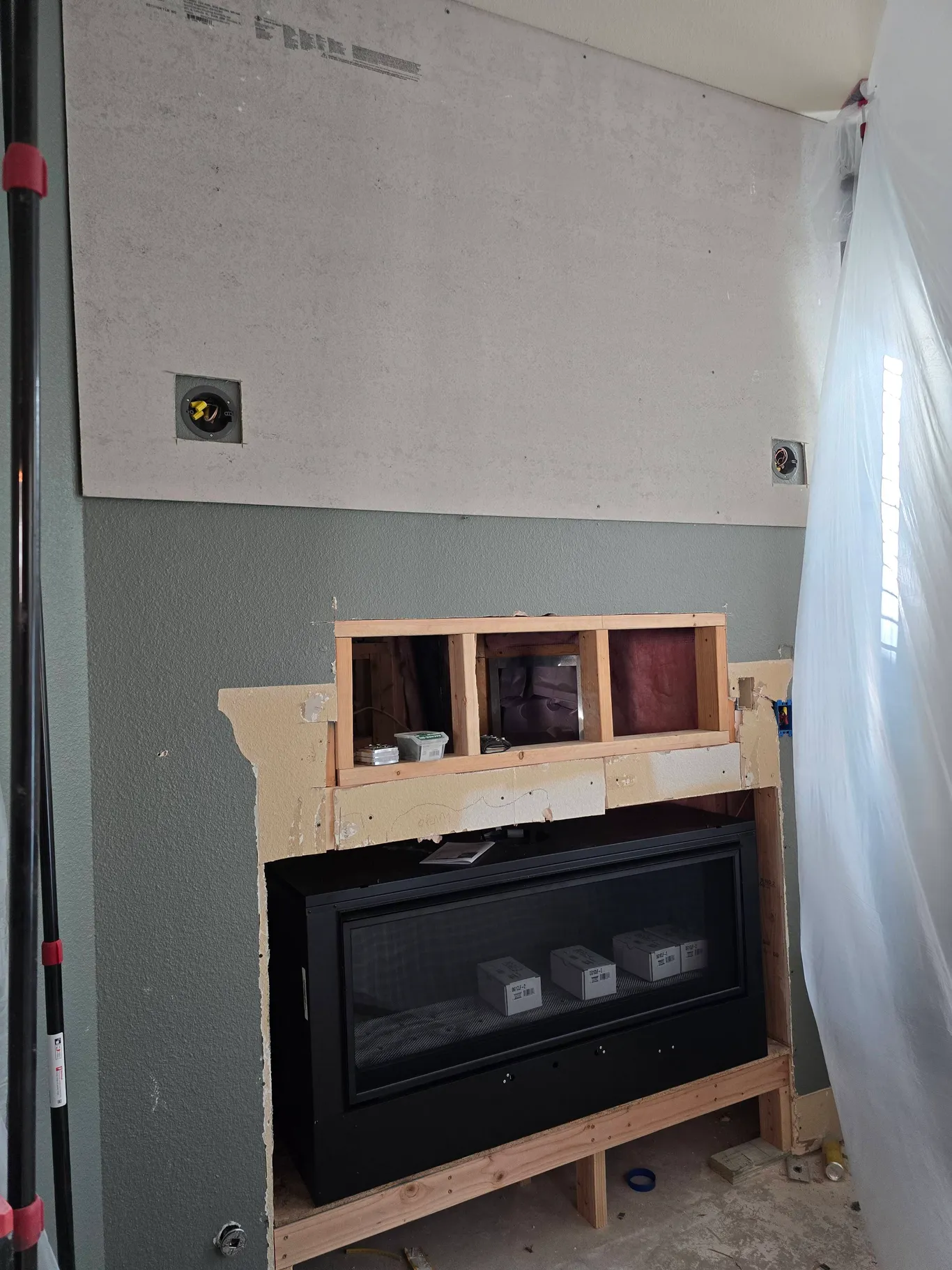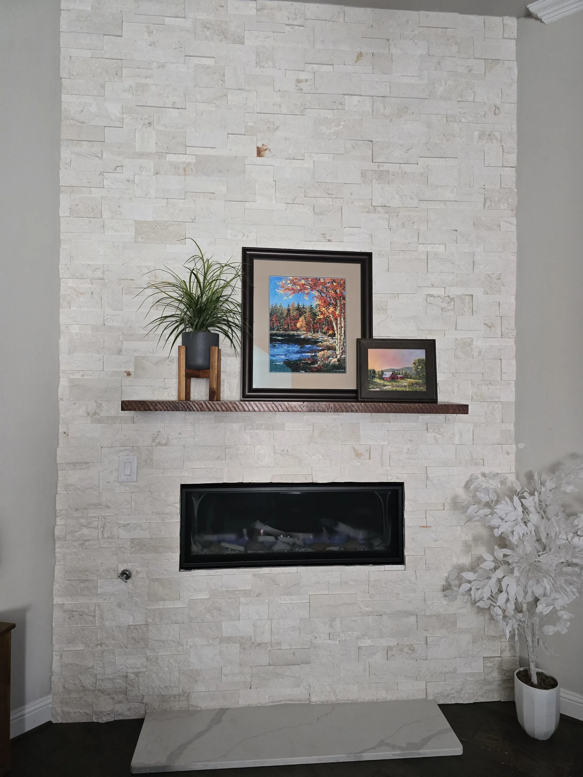 Removed old fireplace to install new linear unit. Stone ledger, hearth, mantel shelf, scone lights and long horn mounted.