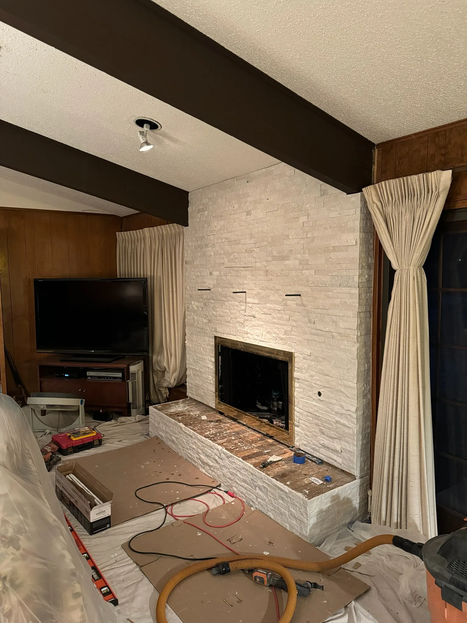 Removed old fireplace, installed glass doors, stone ledger, mantel, hearth and 24" log set